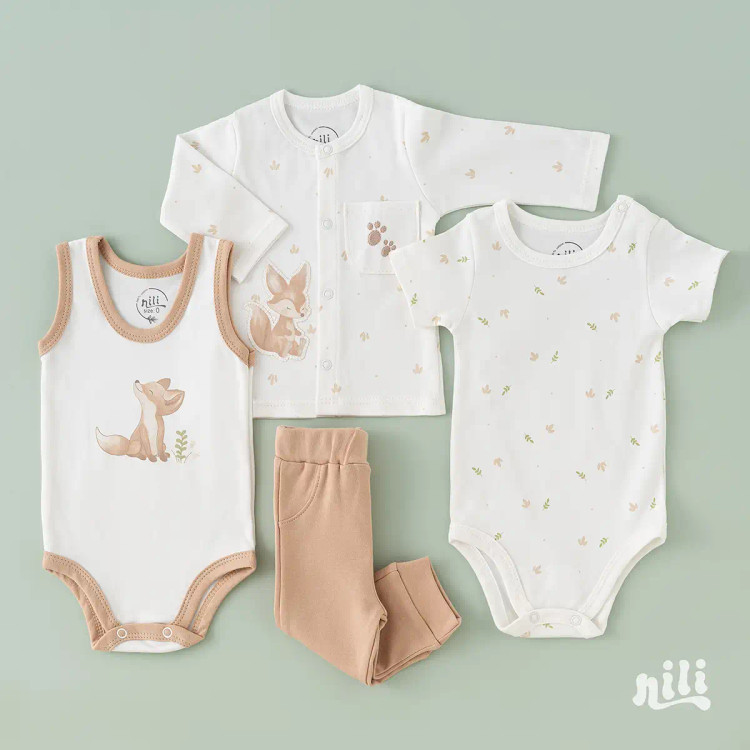 زیردکمه آستین کوتاه، زیردکمه رکابی، سرهمی جورابدار، مانتو، شلوار، پیشبند، کلاه گرد، یک جفت جوراب، یک جفت دستکش، آروغ گیر، دورپیچ نخی کلاه دار