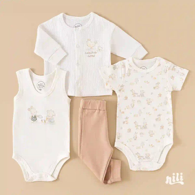 زیردکمه آستین کوتاه، زیردکمه رکابی، سرهمی جورابدار، مانتو، شلوار، پیشبند، کلاه گرد، یک جفت جوراب، یک جفت دستکش، آروغ گیر، دورپیچ نخی کلاه دار