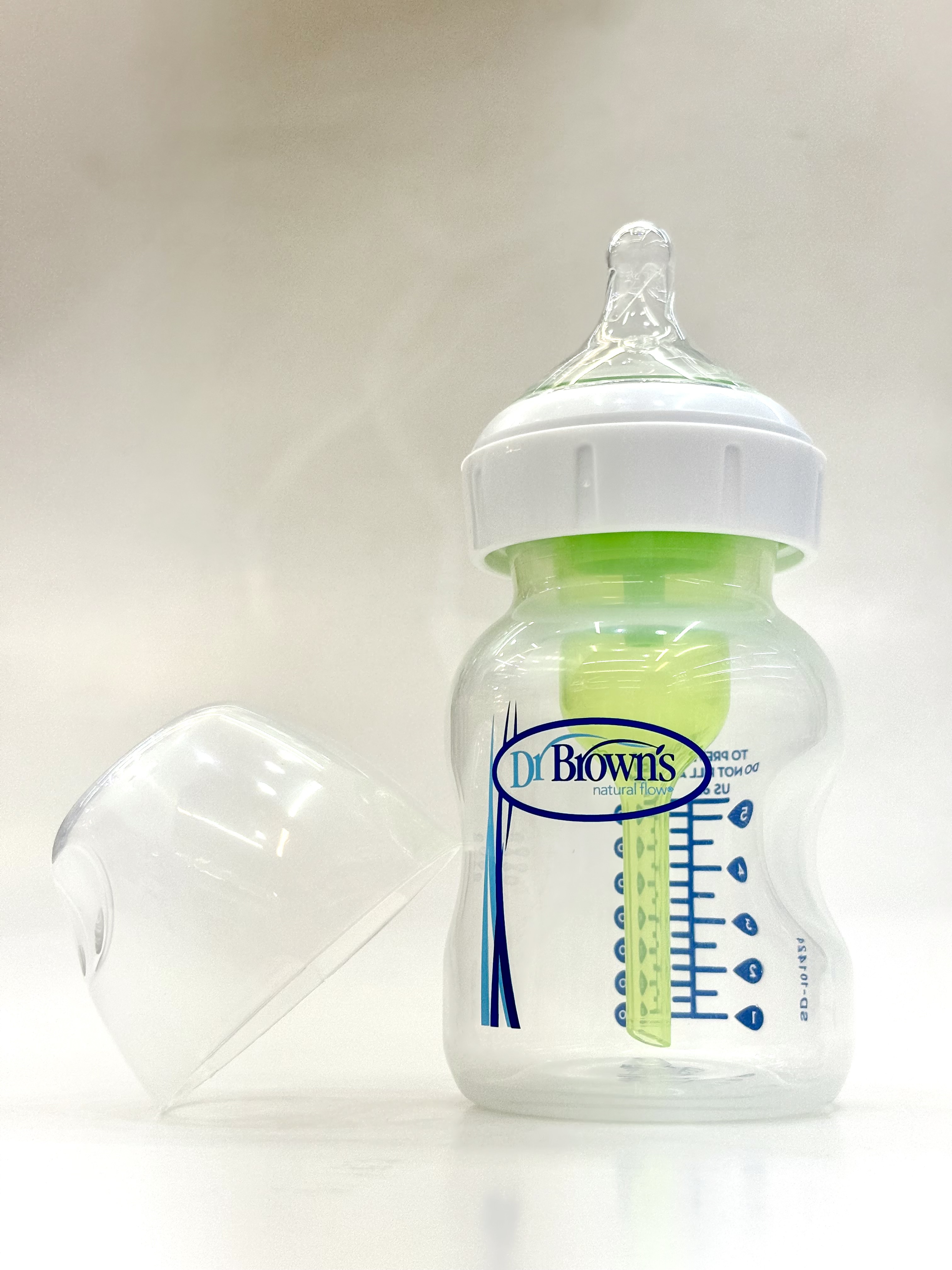 شیشه شیر ۱۵۰ میل دکتر براون مدل Options+ با سیستم گردش هوای پیشرفته، از ورود هوا به داخل شکم نوزاد جلوگیری میکنه و باعث کاهش نفخ، دلدرد و رفلاکس میشه.